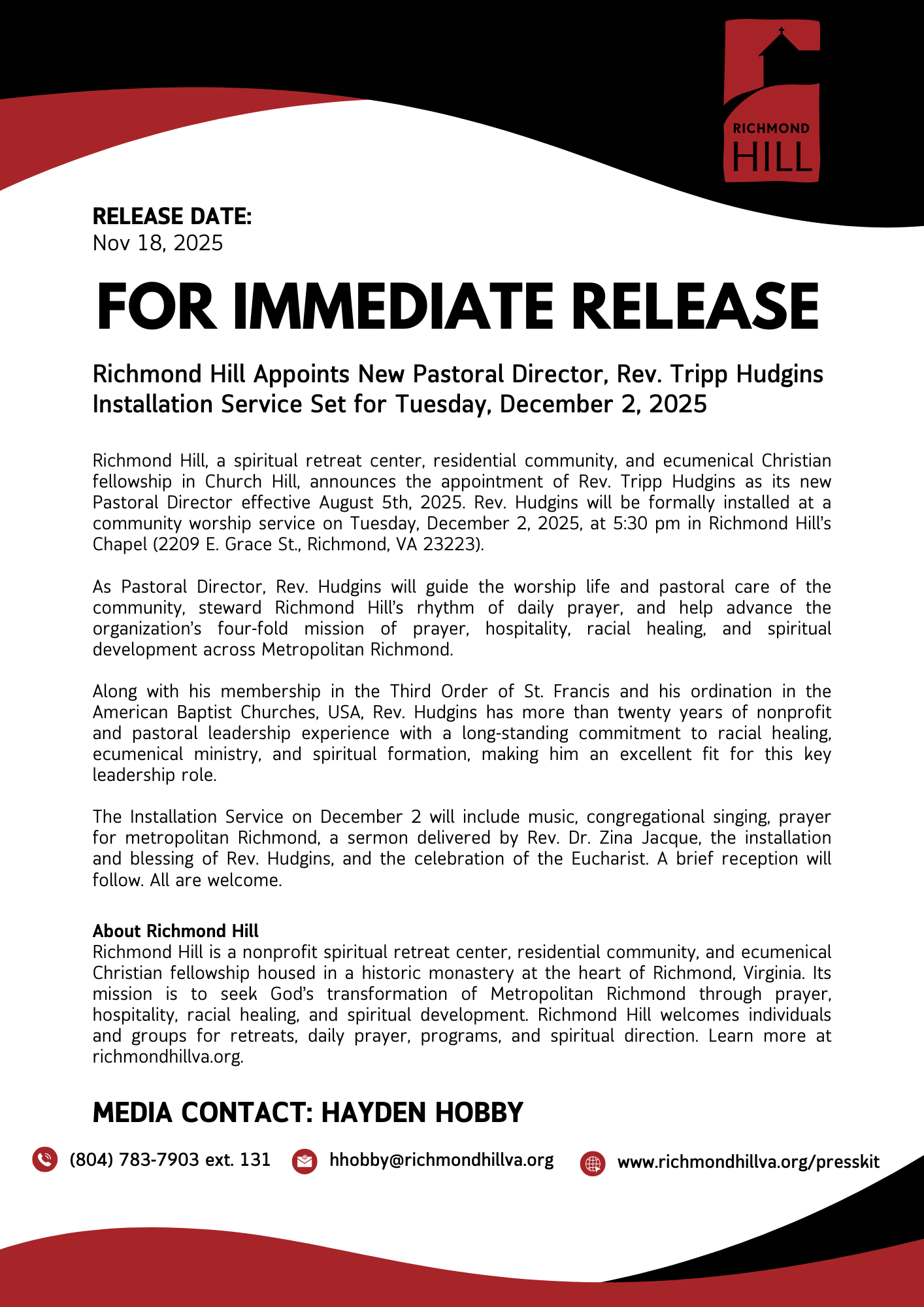 Founded in 1987 in Richmond, Virginia, Richmond Hill is an ecumenical Christian fellowship and residential community who serve as stewards of an urban retreat center within the setting of a historic monastery. Our Mission is to seek Godโs transformation of Metropolitan Richmond through prayer, hospitality, racial healing, and spiritual development.