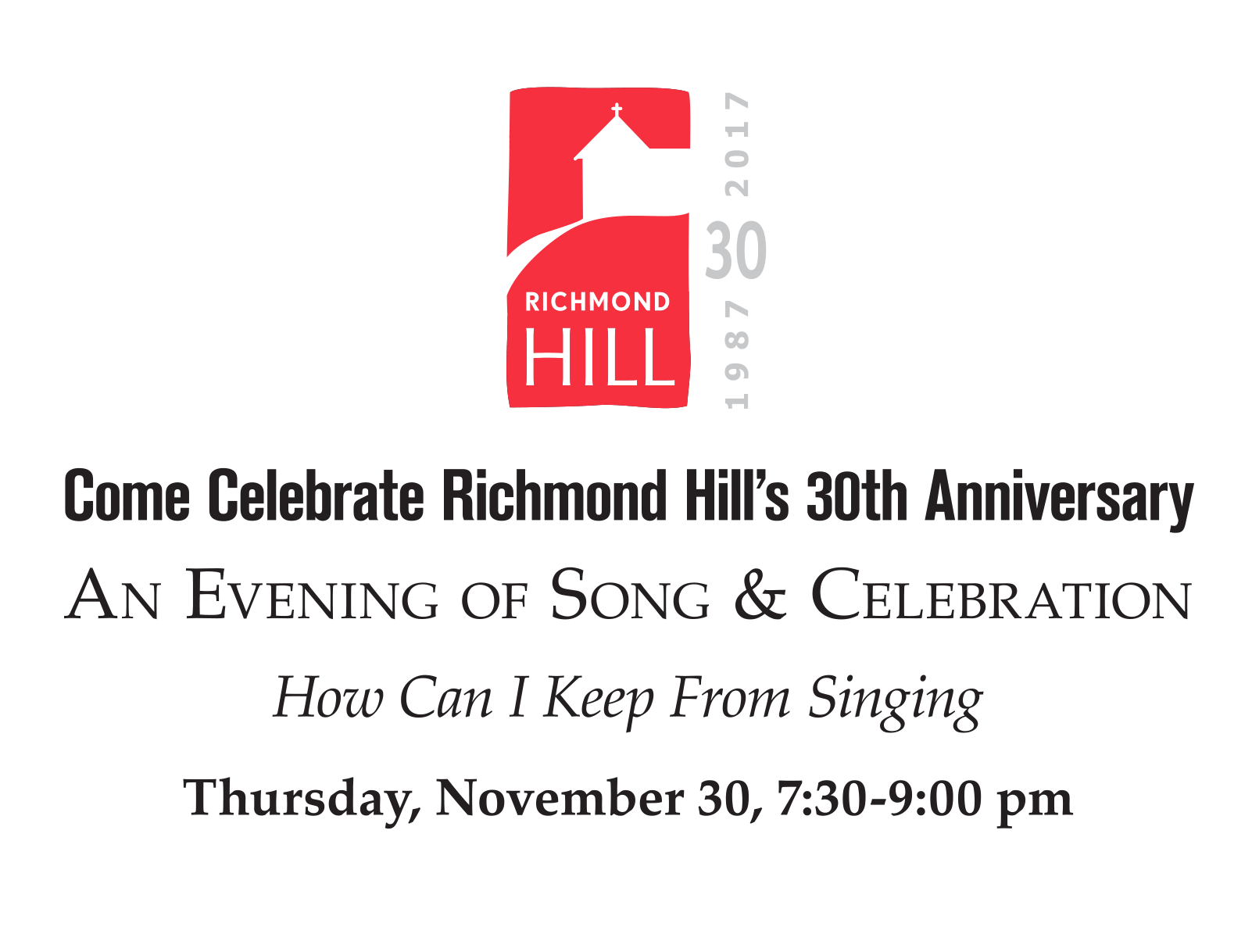Announcements Richmond Hill is turning 30! Updated onNovember 3, 2017 Save the date: November 30 Join us for an evening of Song & Celebration as we commemorate the 30th Anniversary of the founding of Richmond Hill. In addition to Jim Bennett at the piano, we will have special musical guests. Thursday, November 30, 7:30-9 pm. Share this: Share on Facebook (Opens in new window) Facebook Email a link to a friend (Opens in new window) Email More Share on X (Opens in new window) X Share on LinkedIn (Opens in new window) LinkedIn Share on Telegram (Opens in new window) Telegram Share on Threads (Opens in new window) Threads Share on WhatsApp (Opens in new window) WhatsApp